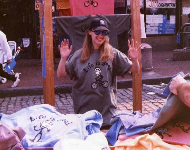It is widely known that Life is Good was started by two gangly, fun loving brothers, but as their business began to grow from the van, to their living room and into the kitchen, they made the important decision to hire the girl upstairs. As described by Bert and John Jacobs in Life is Good: The Book, “As the spring of 1995 rolled around, we had no sales force and no marketing campaign. But demand was growing just the same, and a steady stream of small orders were building. It became clear that we needed more hands on deck to manage the business, so we recruited Kerrie Sherman, the adorable 23-year-old who had recently moved into the apartment upstairs from us.”